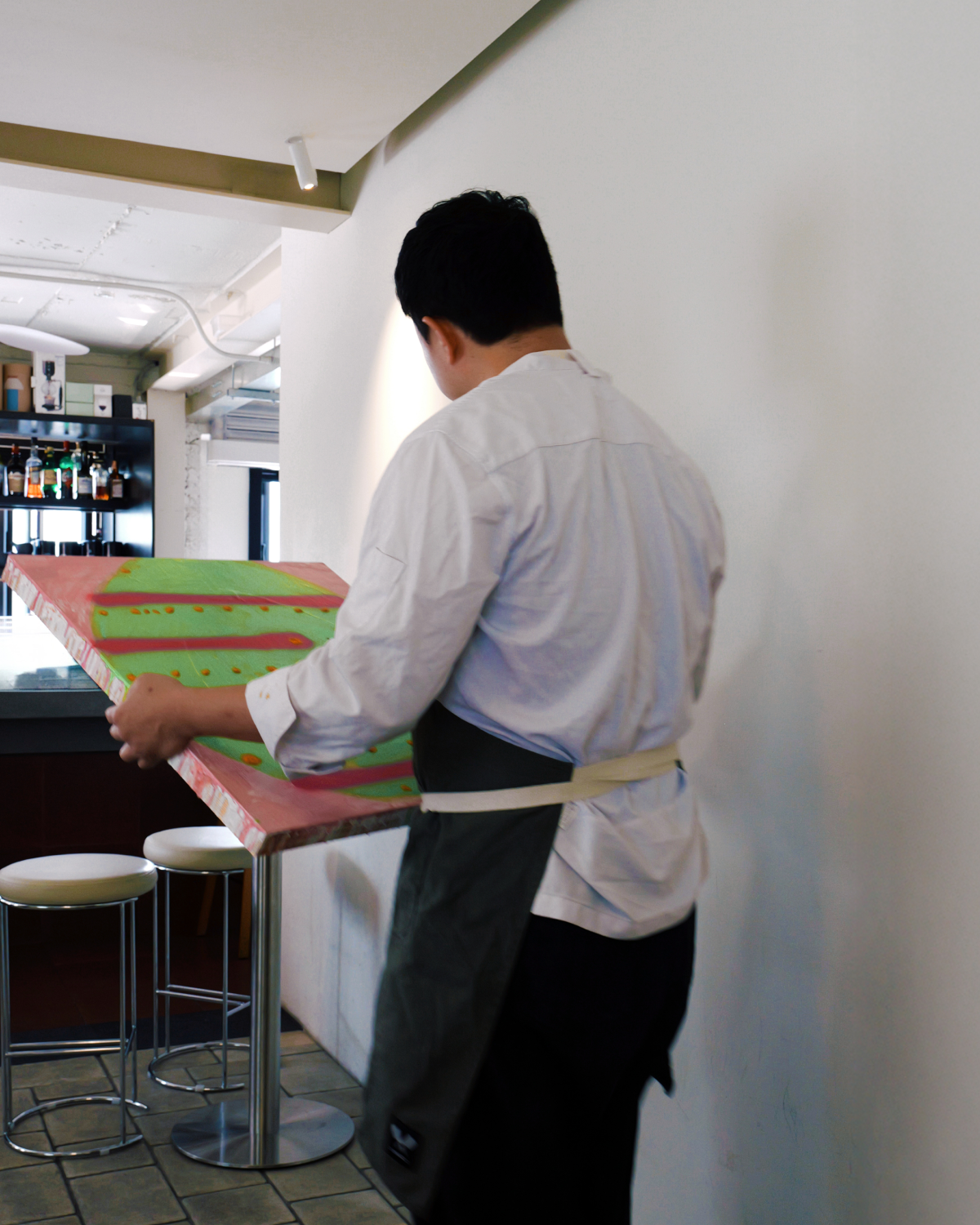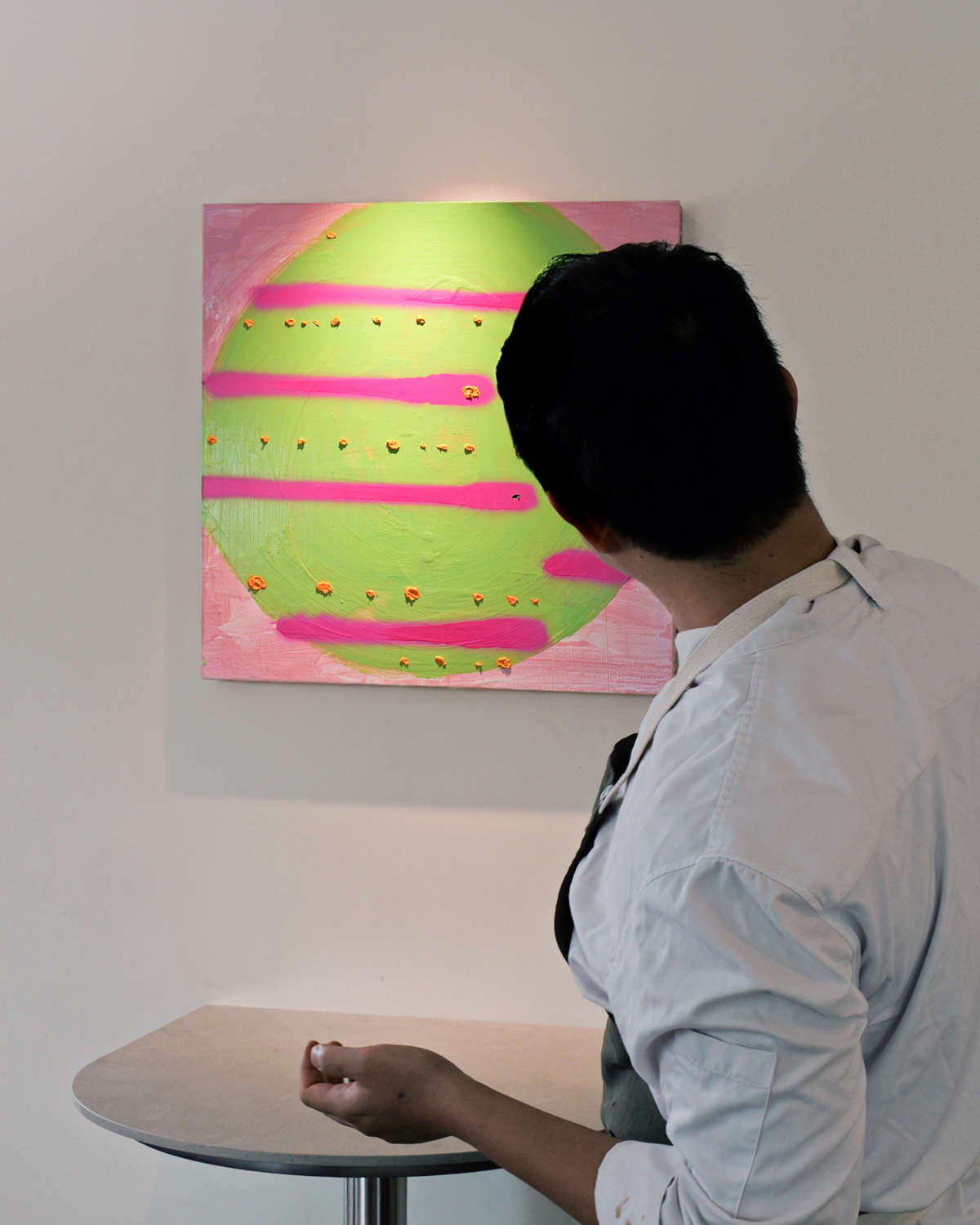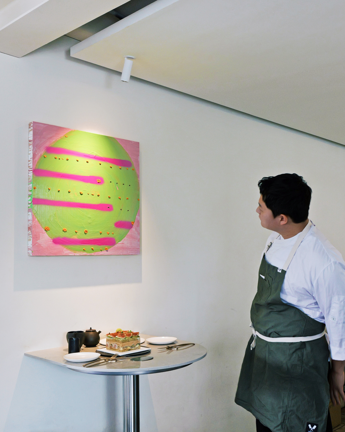 저는 이 작품이 공간에서 하나의 환기(換気) 역할을 해주길 바라요. 공간이 줄 수 있는 분위기에는 어느 정도 한계가 있잖아요. 이곳도 ‘음식’이라는 주제에 맞춰 인테리어나 테이블웨어 같은 요소들이 이미 완성되어 있는데요. 예를 들어 디저트를 내는 접시도 질감이 살아 있는 것을 일부러 선택했어요. 디저트가 주는 시각적인 인상도 중요하지만, 그걸 뒷받침해줄 배경이나 요소가 함께 있어야 더욱 완성도 있는 경험이 될테니까요. 그런 면에서 이 그림도 그런 역할을 해줄 수 있을 거라 기대합니다. 공간 전체는 배경색과 요소들을 절제해 디저트가 돋보이도록 설계되어 있는데요, 김한나 작가님의 작품은 그 위에 또렷한 포커스를 만들어내는 존재감을 지니고 있어요. 매장에 오신 손님들이 디저트를 맛보며 이 그림을 바라볼 때, 제가 원하는 스토리로 설계한 흐름뿐 아니라, 다른 창작자의 감각이 자연스럽게 겹쳐지는 순간을 마주하셨으면 해요. 그래서 이 그림이 제가 만든 디저트를 다각도로 풍부하게 느끼고 감각적으로 확장할 수 있는 연결 지점이 되었으면 합니다.