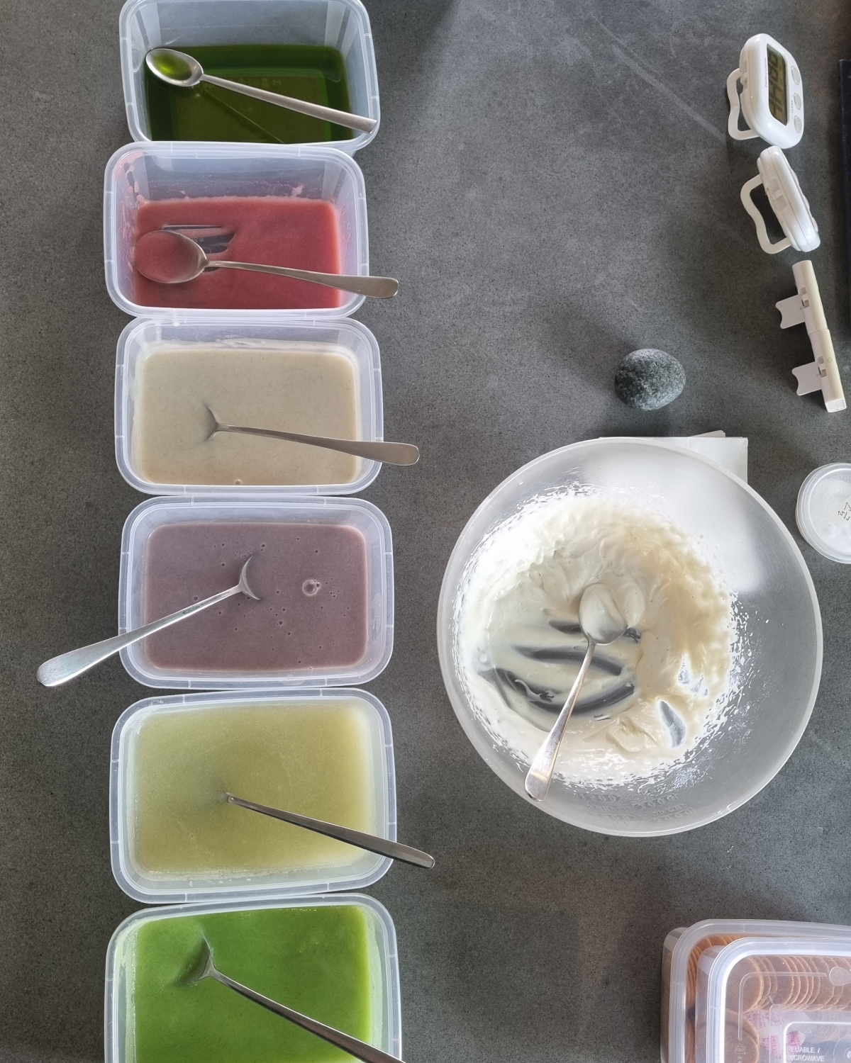 이번에 만들 디저트는 기본적으로 제철, 로컬 재료를 퓨레 상태로 만들어 물, 공기, 지방을 섞어 질감을 완성해보려 합니다. 그리고 그것을 접시에 담아 표현해 보고 싶어요. 접시에 담기면 중력에 의해 자연스럽게 일그러진 구의 형태가 되겠지요. 푸릇한 청사과, 달콤한 복숭아, 상큼한 자두, 뽀얀 깨즙, 부드러운 옥수수 등으로 완성될 예정입니다.