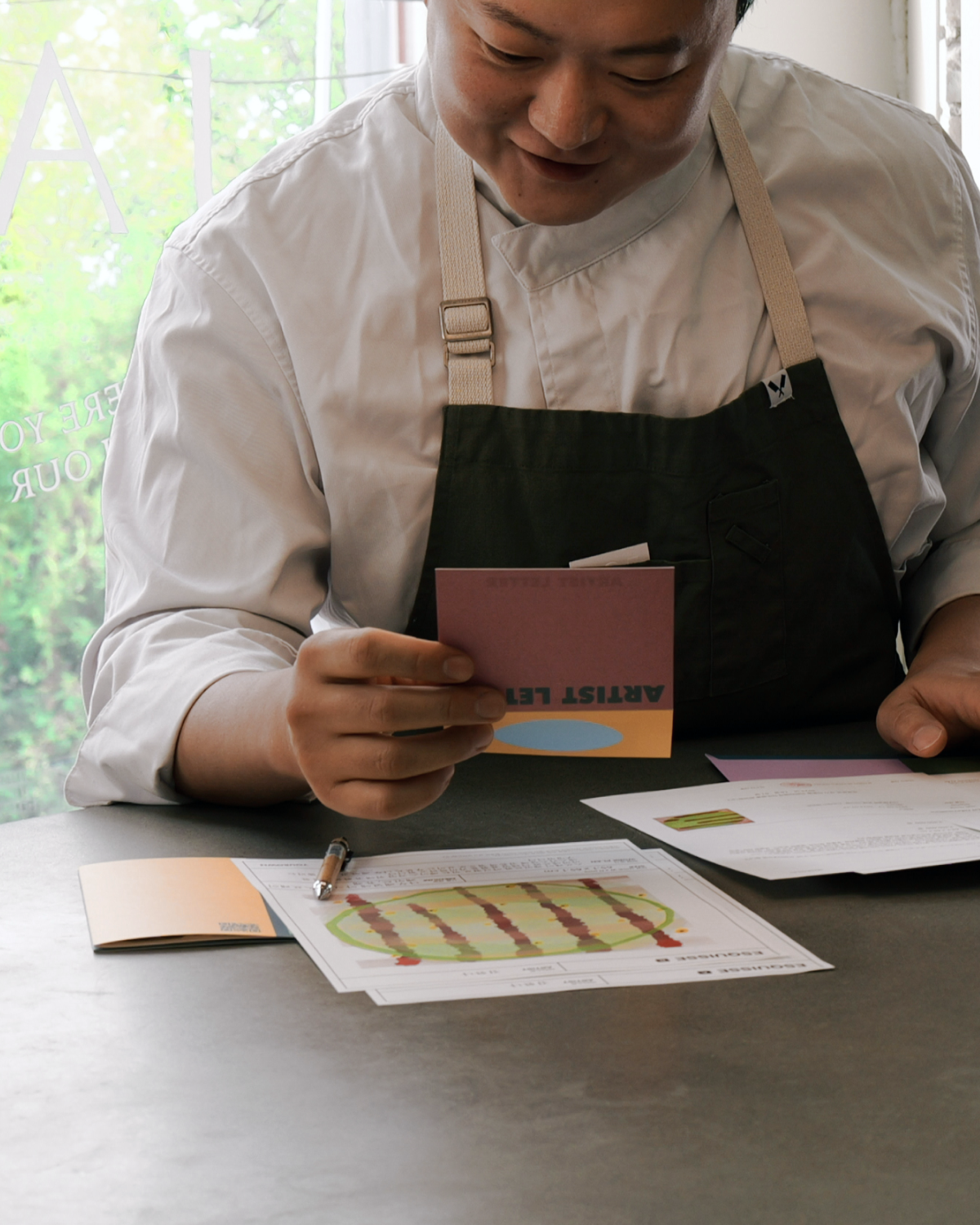 무엇보다 눈에 들어왔던 건 화사한 색감이었는데요. 저도 디저트를 만들 때 색을 어떻게 연출하느냐를 굉장히 중요하게 생각하거든요. 특히 ‘이 색이 죽지 않았는가’ 하는 고민을 많이 해요. 디저트에서는 공기, 물, 지방 같은 요소들이 섞이면서도 재료 본연의 색이 선명하게 살아 있을수록, 그 안에 담긴 자연의 맛도 같이 살아난다고 느끼거든요. 조금 더 들어가면, 엽록소나 안토시아닌 같은 색소들도 실제로 맛과 어느 정도 관련이 있어요. 그래서 저는 늘 색을 보면서 맛을 생각하고, 반대로 맛을 상상하면서 색을 떠올리는 식으로 작업할 때 항상 색감에 많이 집중해요. 그런 면에서 김한나 작가님의 작업에는 ‘색의 맛’이 분명하게 담겨 있었어요. 그래서 이분이라면 내가 이야기하고 싶은 것을 시각적으로 잘 풀어내주실 수 있겠다’는 긍정적인 확신이 들었습니다.