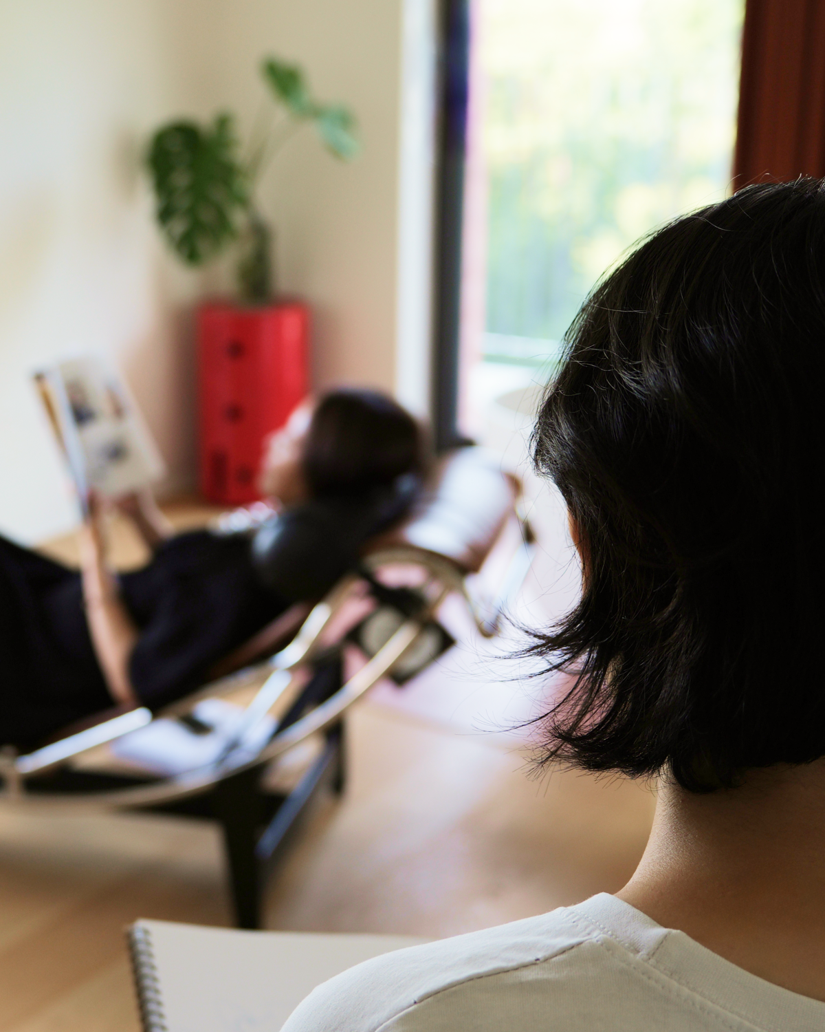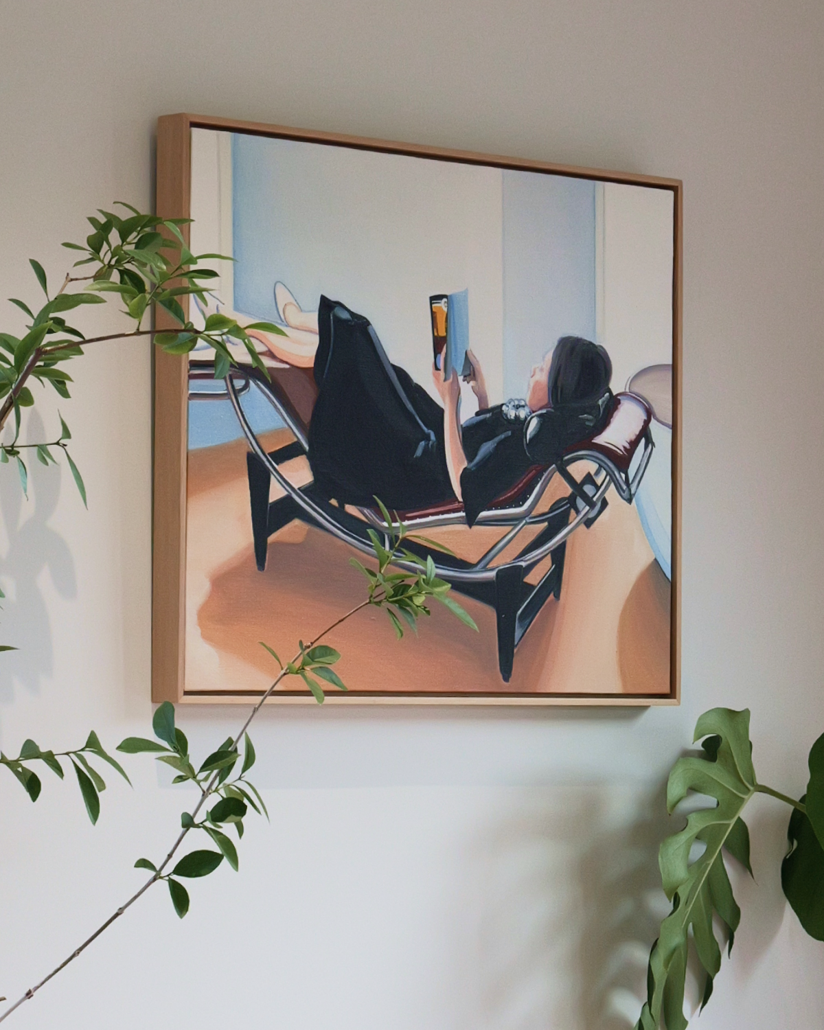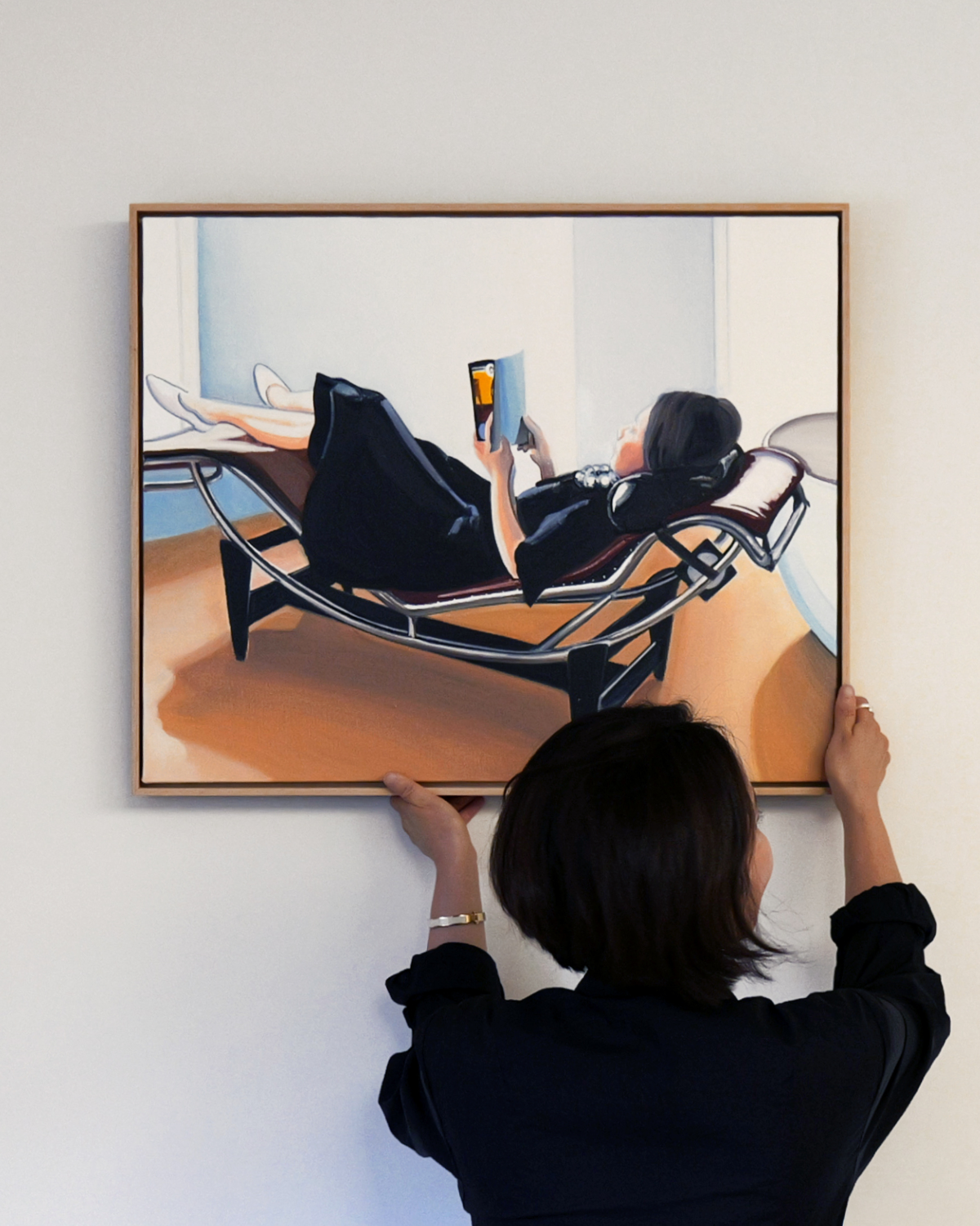 특히 제가 오마주하고 싶었던 장면은, 이 의자에 길게 누운 채 우아하게 고개를 돌리고 있는 샤를로트 페리앙의 흑백 사진입니다. 처음 그 사진을 본 이후, 언젠가는 나도 이 의자에 누워 있는 나만의 모습을 기록해두고 싶다고 생각해 왔어요. 저는 평소 집에서 이 의자에 기대어 책을 읽거나 영화를 보거나, 음악을 듣거나, 가끔은 낮잠을 자며 온전한 휴식을 즐기고는 합니다. 잠을 자거나 식사할 때를 제외하면 거의 대부분의 휴식이 이 의자에서 이루어진다고 해도 과언이 아니에요. 그래서 이 장면을 가장 좋아하는 의자 곁에 둘 그림으로 남기고 싶습니다. 참고로, 저의 ‘셰즈 롱그’는 브라운 가죽 시트에 블랙 가죽 헤드레스트가 더해진 모델입니다.