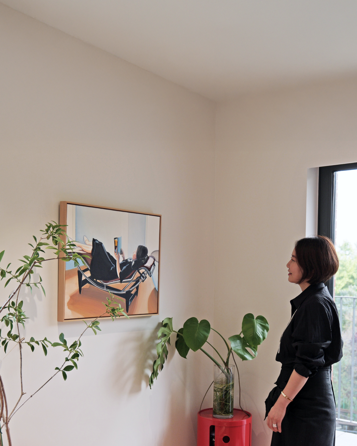 처음부터 이 그림은 4층에 걸고 싶었어요. 제가 가장 아끼는 셰즈 롱그도 그 공간에 있고, 그 의자가 있는 방이 제가 가장 편하게 느끼는 곳이거든요. 그 방은 욕실이 함께 있는 저만의 공간인데, 하루 중 가장 자주 드나드는 곳이에요. 아침에 눈을 떴을 때, 바로 움직이긴 좀 힘들잖아요. 저는 그럴 때 늘 그 의자에 누워 잠시 ‘뜸 들이는 시간’을 가져요. 말 그대로, 밥을 뜸 들이듯이요. 정신을 차리기 전까지 잠깐 멍하니 누워 있는 거죠. 아무 생각도 안 하고 바깥을 바라보는 그 시간이 저에게는 꽤 중요해요.