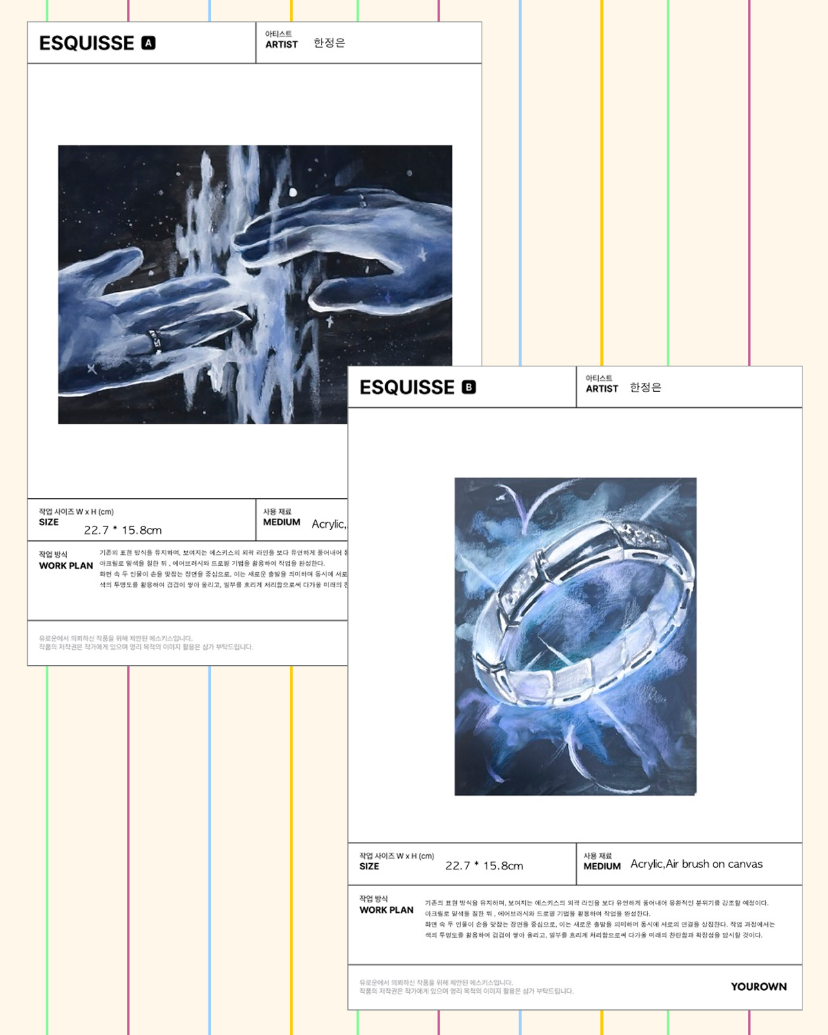 두 가지 시안 모두 처음 보는 순간 설렘과 기대가 뒤섞였다고 해요. 서로 전혀 다른 분위기를 지닌 시안이었기에 선택이 쉽지 않았지만, 윤진님은 우주처럼 넓은 배경 속에 반지가 크게 등장하는 시안을 최종 선택했습니다. 이유는 명확했습니다. 시각적으로 강렬하면서도, 공간에 걸렸을 때 시각적으로 중심을 잡아줄 수 있을 만큼의 존재감, 그리고 그 안에 담긴 복합적인 감정이 윤진님이 표현하고자 했던 감정과 맞닿아 있었기 때문입니다.
