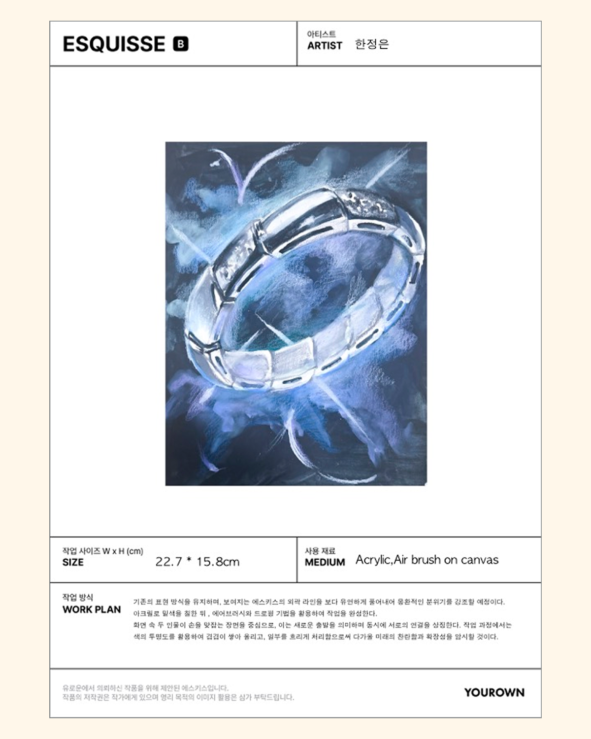 사랑의 약속이 담긴 반지를 모티프로, 윤진님은 단순한 물건을 넘어 시간 속에서 함께 깊어지는 감정을 그림으로 남기고 싶다는 마음을 품었습니다. 견고하면서도 변화무쌍한 감정, 과거와 현재 그리고 미래를 함께 품은 아련함과 기대감까지, 그 모든 순간을 하나의 작품에 담고자 했습니다.