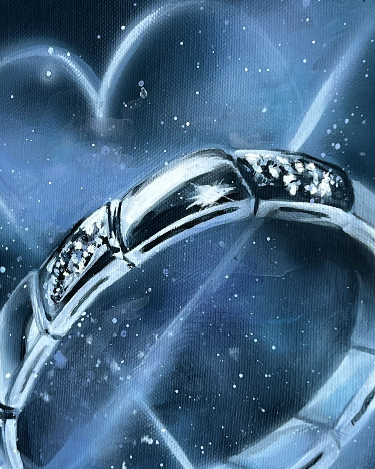 최근에 남자친구에게 프로포즈 반지를 받았습니다. 반지는 사랑의 징표이자 영원함의 상징입니다. 사랑은 단순히 변치 않는 견고함만이 아니라, 그 견고함 속에서도 다채롭게 변화하는 것이라고 생각합니다. 사랑의 영속성과 동시에 변화무쌍함, 그리고 과거와 현재와 미래를 함께하는 아련함과 기대감을 반지라는 물건을 통해 그림으로 표현해 주시면 좋겠습니다.