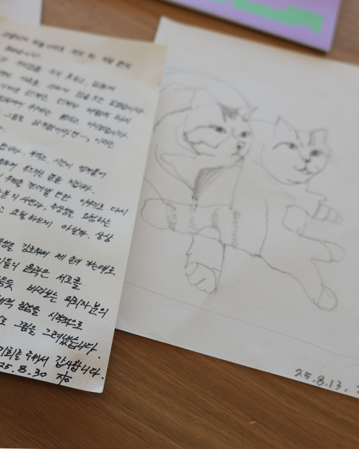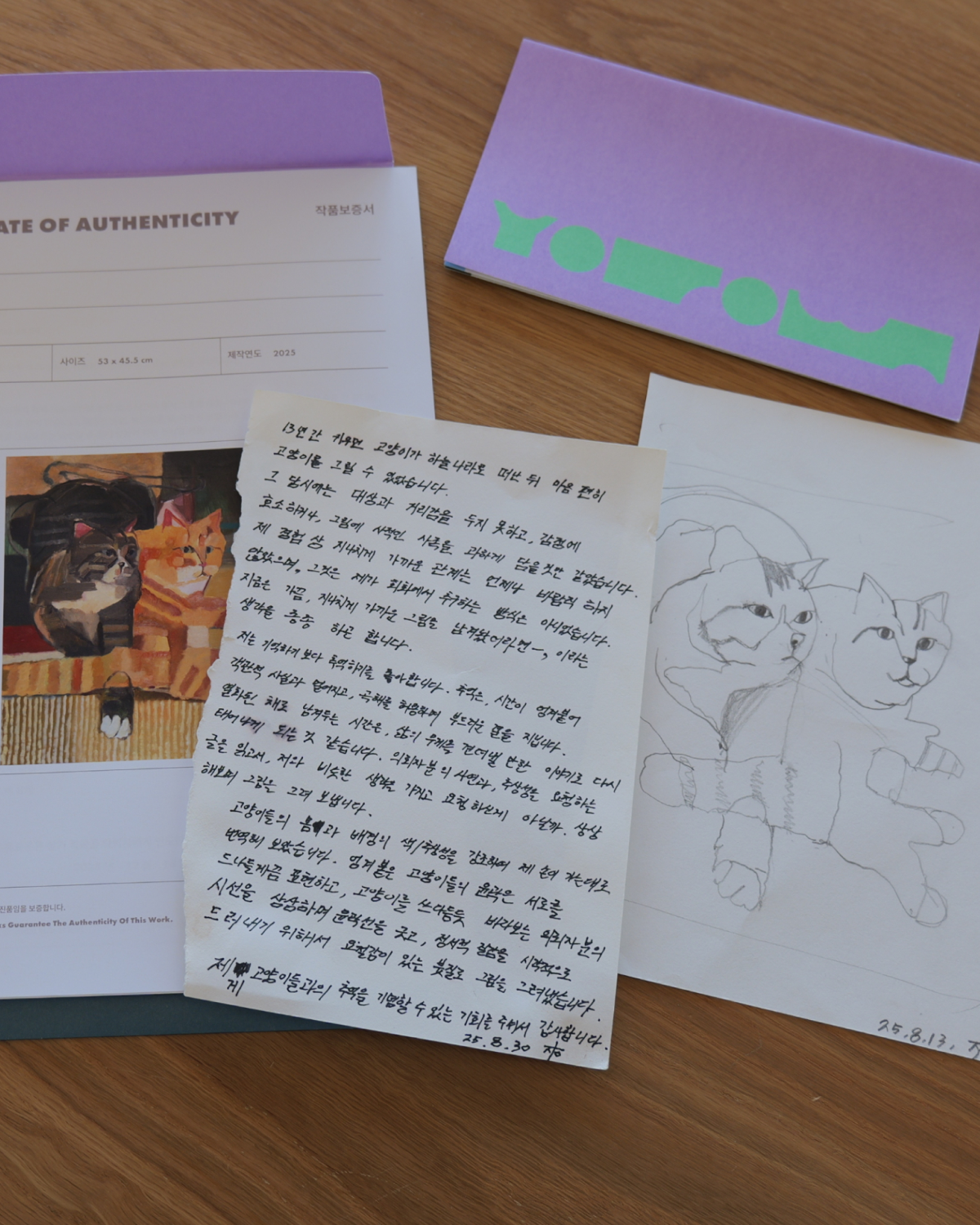 이런저런 말들을 많이 썼지만, 사연자분께서 바라보기 나름인 그림이었으면 좋겠습니다. 하여 제목도 어떤 제 상념을 투영하기보다 그냥 담백하게 '고양이 두 마리'로 지었습니다. 제가 고양이들과의 추억을 기념하게 할 수 있는 기회를 주셔서 감사합니다.”