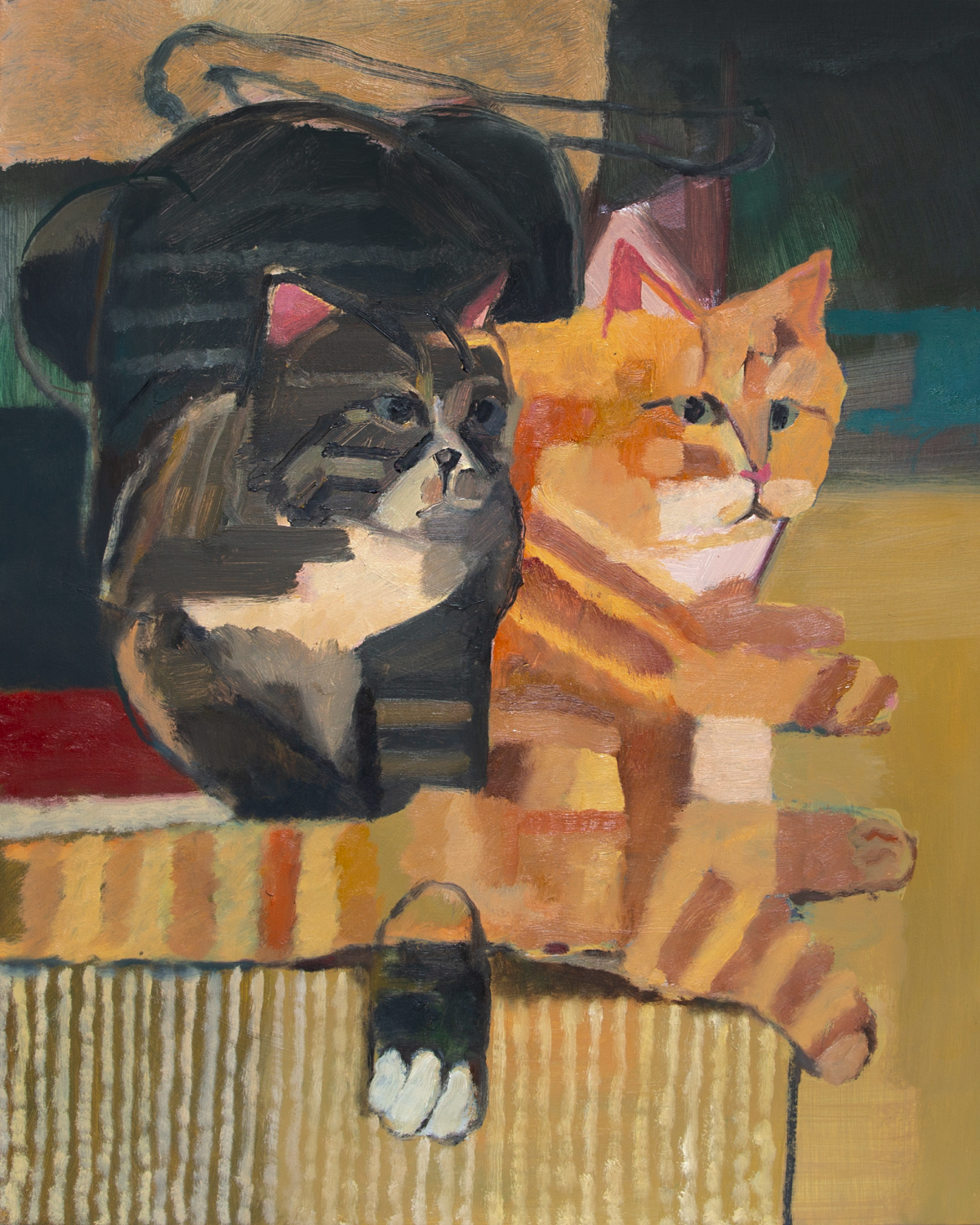 엉겨 붙은 고양이들의 윤곽은 서로의 영역을 드나들게끔 표현하고, 고양이들을 쓰다듬듯 바라보는 의뢰자 분의 시선을 상상하며 형상의 윤곽선을 긋고, 정서적 질감을 시각적으로 드러내기 위해서 요철감이 있는 붓질로 그림을 그려 냈습니다.