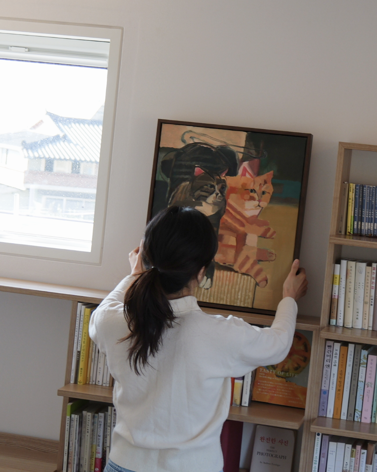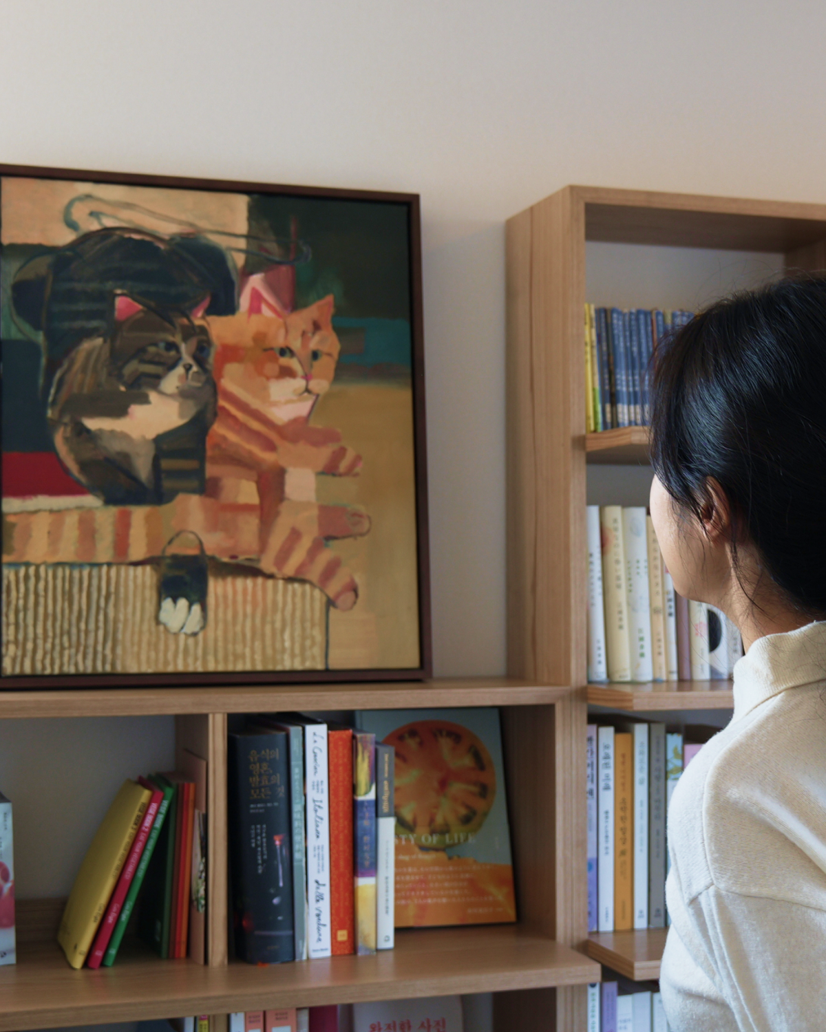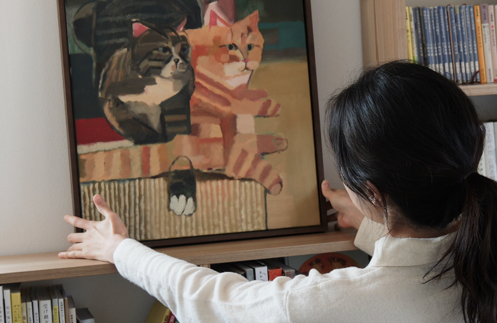 그림은 1층에 있는 고양이들을 위한 공간에 두려고 해요. 캣타워 대신 아이들이 오르내릴 수 있도록 단을 높여 만든 책장이 있는데, 그곳 창가에 앉아 바깥 구경하는 걸 좋아하거든요. 아이들이 그곳에 머물 때 그림과 실제 모습이 함께 어우러지는 풍경을 보고 싶습니다.